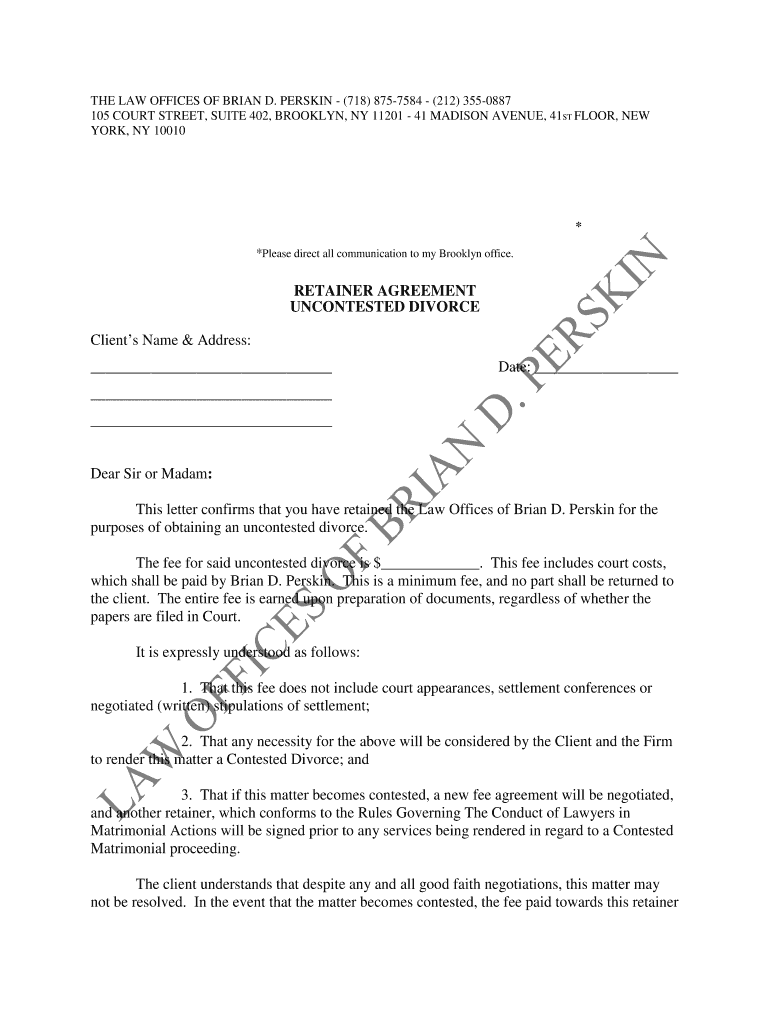 Utilizing an uncontested divorce retainer agreement offers numerous advantages for clients seeking a divorce in New York. Primarily, it provides transparency regarding the fees and legal services involved, minimizing potential conflicts or misunderstandings in the future.