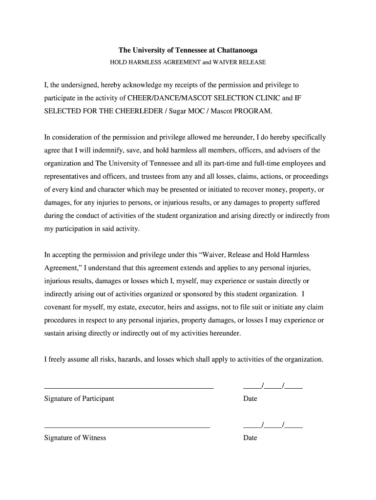 The University of Tennessee at Chattanooga HOLD HARMLESS AGREEMENT and WAIVER RELEASE I, the undersigned, hereby acknowledge my receipts of the permission and privilege to participate in the activity
