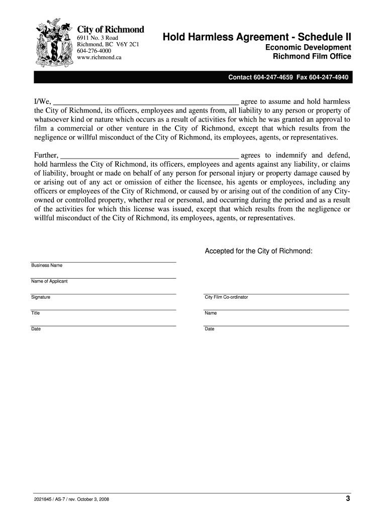 City of Richmond 6911 No. 3 Road Richmond, BC V6Y 2C1 6042764000 www.richmond.ca Hold Harmless Agreement Schedule II Economic Development Richmond Film Office Contact 6042474659 Fax 6042474940 I/We,
