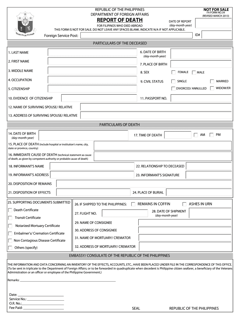 NOT FOR SALE REPUBLIC OF THE PHILIPPINES DEPARTMENT OF FOREIGN AFFAIRS FA FORM NO.39 (REVISED MARCH 2013) REPORT OF DEATH DATE OF REPORT (daymonthyear) FOR FILIPINOS WHO DIED ABROAD THIS FORM IS NOT