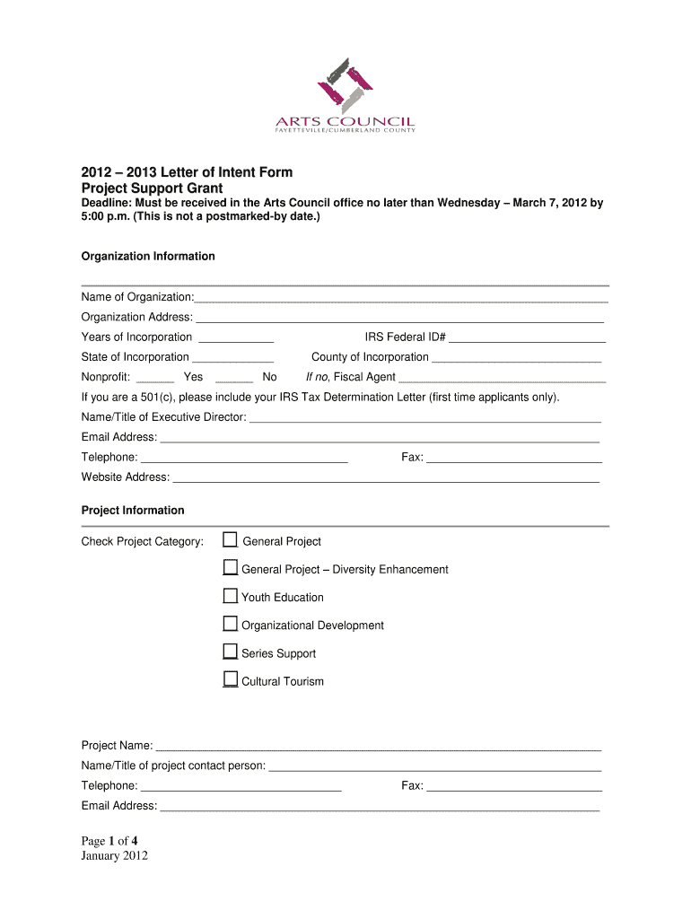 2012 2013 Letter of Intent Form Project Support Grant Deadline: Must be received in the Arts Council office no later than Wednesday, March 7, 2012, by 5:00 p.m. (This is not a postmarked-by date.)