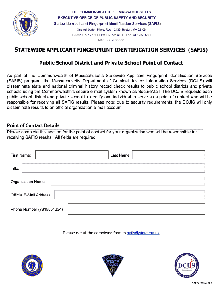The completed form should be emailed to the Massachusetts Department of Criminal Justice Information Services (DCJIS).