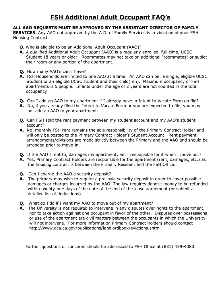 Q. How many AAO s can I have A. FSH Households are limited to one AAO at a time. An AAO can be a single eligible UCSC Student or an eligible UCSC student and their child ren. For more information Primary Contract Holders should contact http //www. dca.ca.gov/publications/landlordbook/evictions. Shtml. Further questions or concerns should be addressed to FSH Office at 831 459-4080. Information Form Applying For Apartment Additional Adult Occupant Information AAO Name Date of Birth Last First...