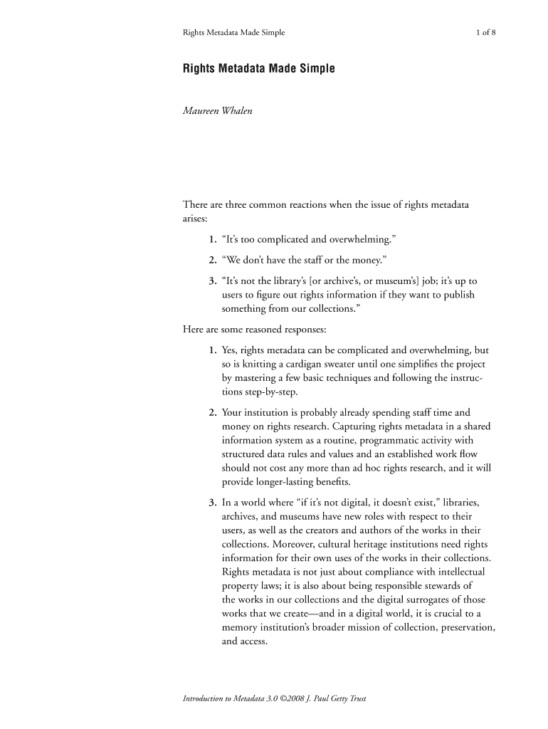Rights Metadata Made Simple1 of 8Rights Metadata Made Simple Maureen WhalenThere are three common reactions when the issue of rights metadata arises: 1. It's too complicated and overwhelming. 2. We
