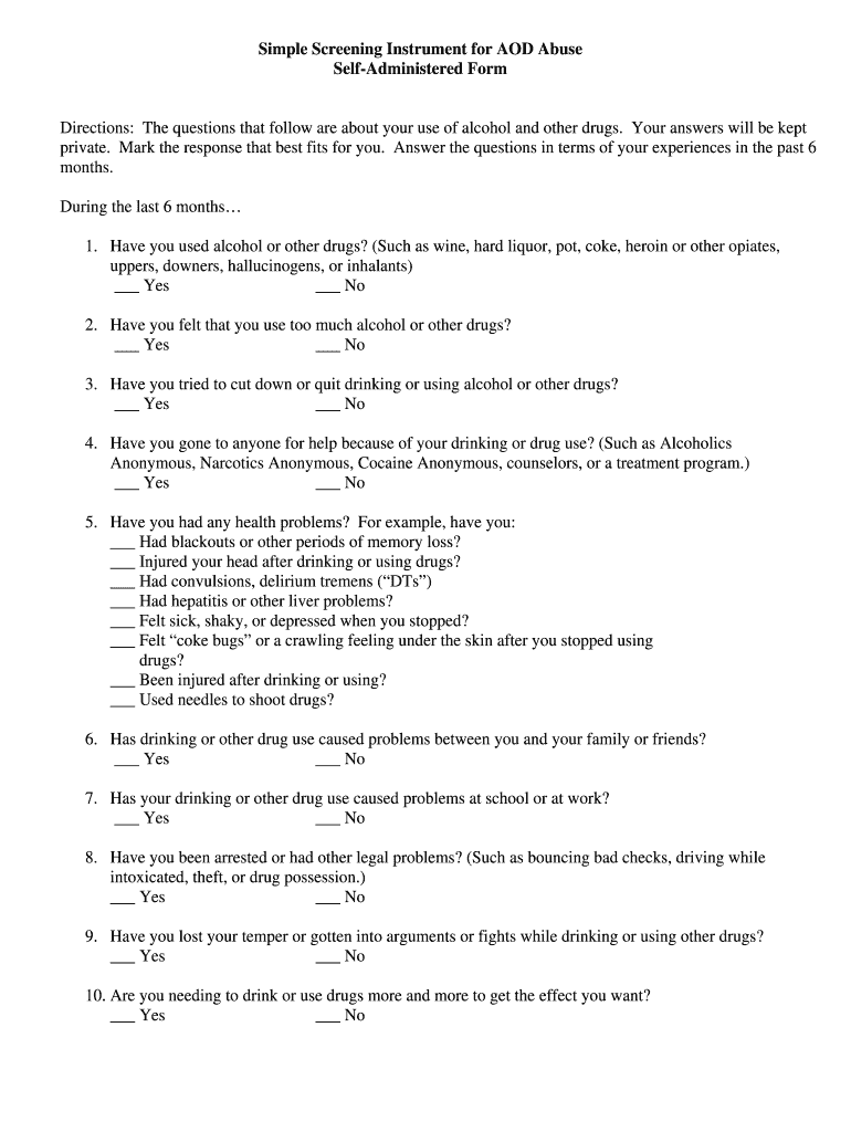 The AOD Abuse Screening Form is a self-administered questionnaire used by individuals to assess alcohol and other drug (AOD) abuse risks.