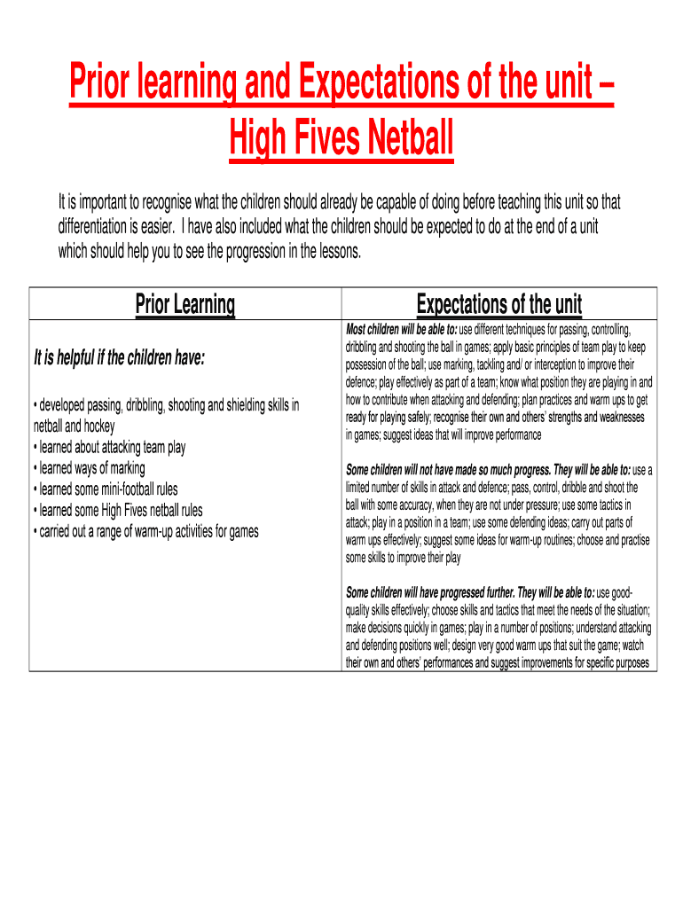 Prior learning and Expectations of the unit High Fives Netball It is important to recognize what the children should already be capable of doing before teaching this unit so that differentiation is