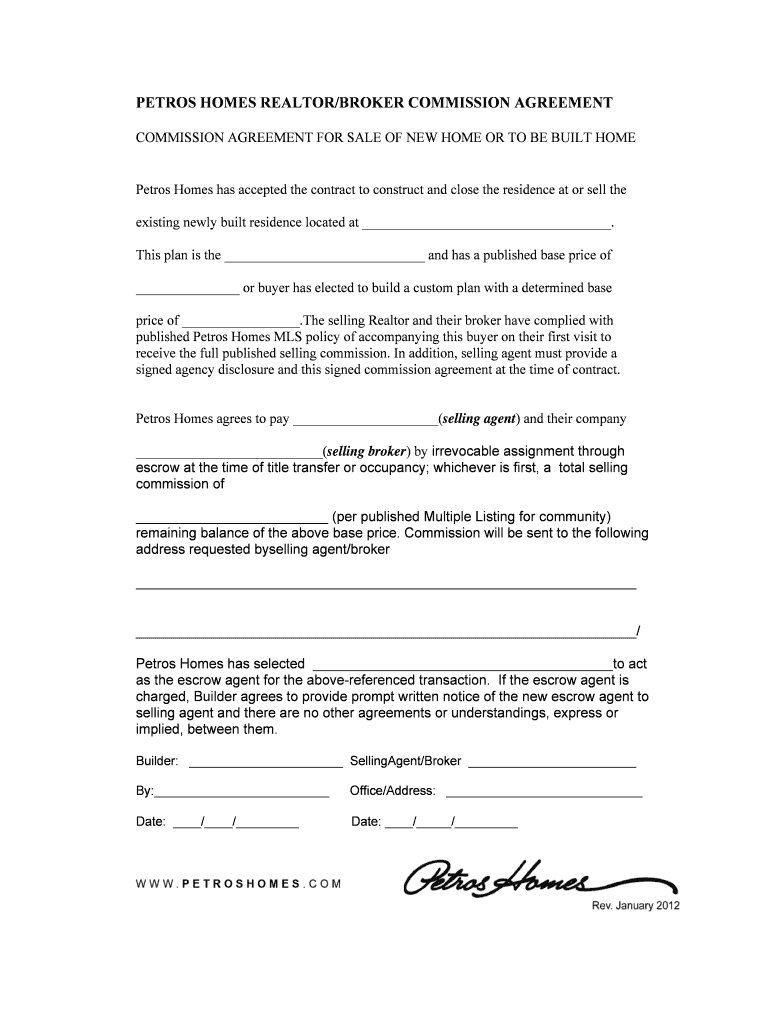 Commission will be sent to the following address requested byselling agent/broker as the escrow agent for the above-referenced transaction. If the escrow agent is charged Builder agrees to provide prompt written notice of the new escrow agent to selling agent and there are no other agreements or understandings express or implied between them. Builder SellingAgent/Broker Office/Address Date //. PETROS HOMES REALTOR/BROKER COMMISSION AGREEMENT COMMISSION AGREEMENT FOR SALE OF NEW HOME OR TO BE...