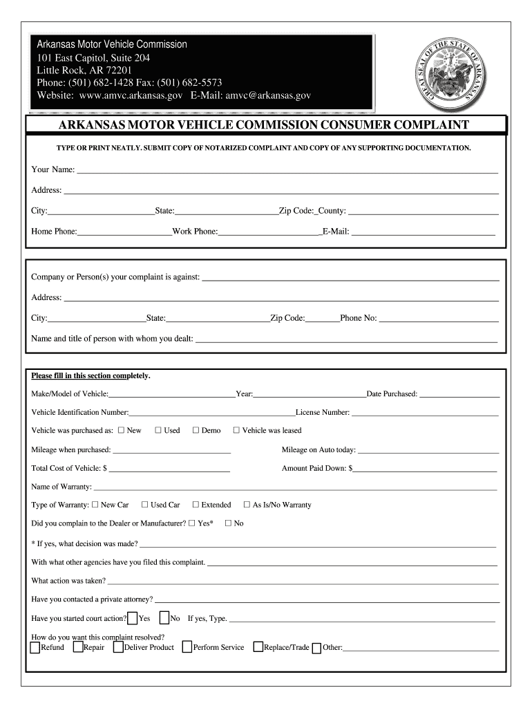 Amvc.arkansas. gov E-Mail amvc arkansas. gov ARKANSAS MOTOR VEHICLE COMMISSION CONSUMER COMPLAINT TYPE OR PRINT NEATLY. If the dealer violated any part of the Arkansas Motor Vehicle Commission ACT. Certain Fraudulent Misrepresentations. In many disputes neither side is 100 correct. What is the first step to file a complaint The consumer must live in Arkansas or the business must be located in Arkansas. The dealer did not tell you about a problem with your vehicle. You think someone tampered...