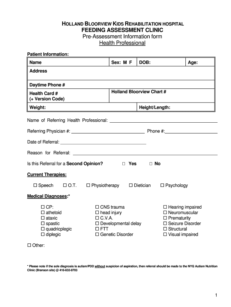 HOLLAND BLOORVIEW KIDS REHABILITATION HOSPITAL FEEDING ASSESSMENT CLINIC Pre-Assessment Information form Health Professional Patient Information Name Sex M F DOB Age Address Daytime Phone Holland Bloorview Chart Health Card Version Code Weight Height/Length Name of Referring Health Professional Referring Physician Phone Date of Referral Reason for Referral Is this Referral for a Second Opinion Yes No Current Therapies Speech O.T. Physiotherapy Dietician Psychology Medical Diagnoses CP...