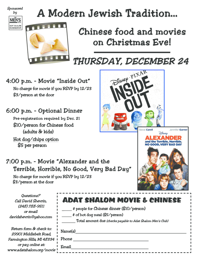 Com Return form check to 29901 Middlebelt Road Farmington Hills MI 48334 or pay online at www. adatshalom.org/movie ADAT SHALOM MOVIE CHINESE people for Chinese dinner 10/person of hot dog meal 5/person Total amount due checks payable to Adat Shalom Men s Club Name s Phone Email. Sponsored by A Modern Jewish Tradition.. Chinese food and movies on Christmas Eve THURSDAY DECEMBER 24 4 00 p.m. - Movie Inside Out No charge for movie if you RSVP by 12/23 3/person at the door 6 00 p.m. - Optional...