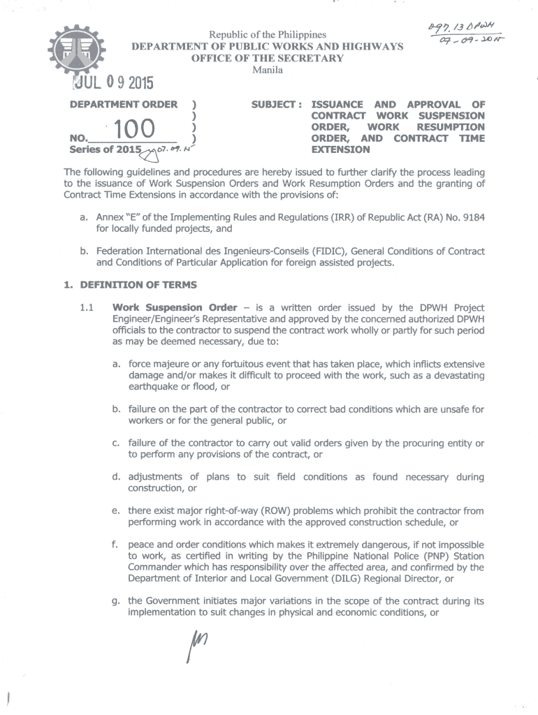 B 'J./.3 f), JT,J1iRepublic of the PhilippinesDEPARTMENT OF PUBLIC WORKS AND HIGHWAYS OFFICE OF THE Secretary. ManilaDEPARTMENTORDER)).100)NO. Series of20152 ':f7. “, .) /I “SUBJECT: ISSUANCE