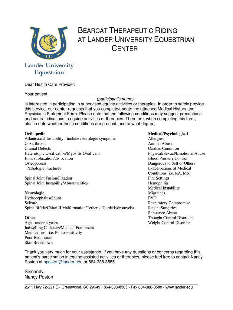 Individuals who wish to participate in the bearcat formrapeutic riding program are required to file the necessary paperwork.
