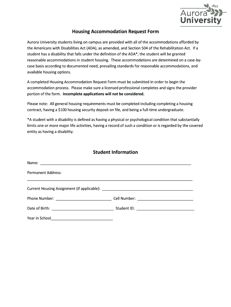 Housing Accommodation Request Form Aurora University students living on campus are provided with all of the accommodations afforded by the Americans with Disabilities Act ADA as amended and Section 504 of the Rehabilitation Act. If a student has a disability that falls under the definition of the ADA the student will be granted reasonable accommodations in student housing. These accommodations are determined on a case-bycase basis according to documented need prevailing standards for...