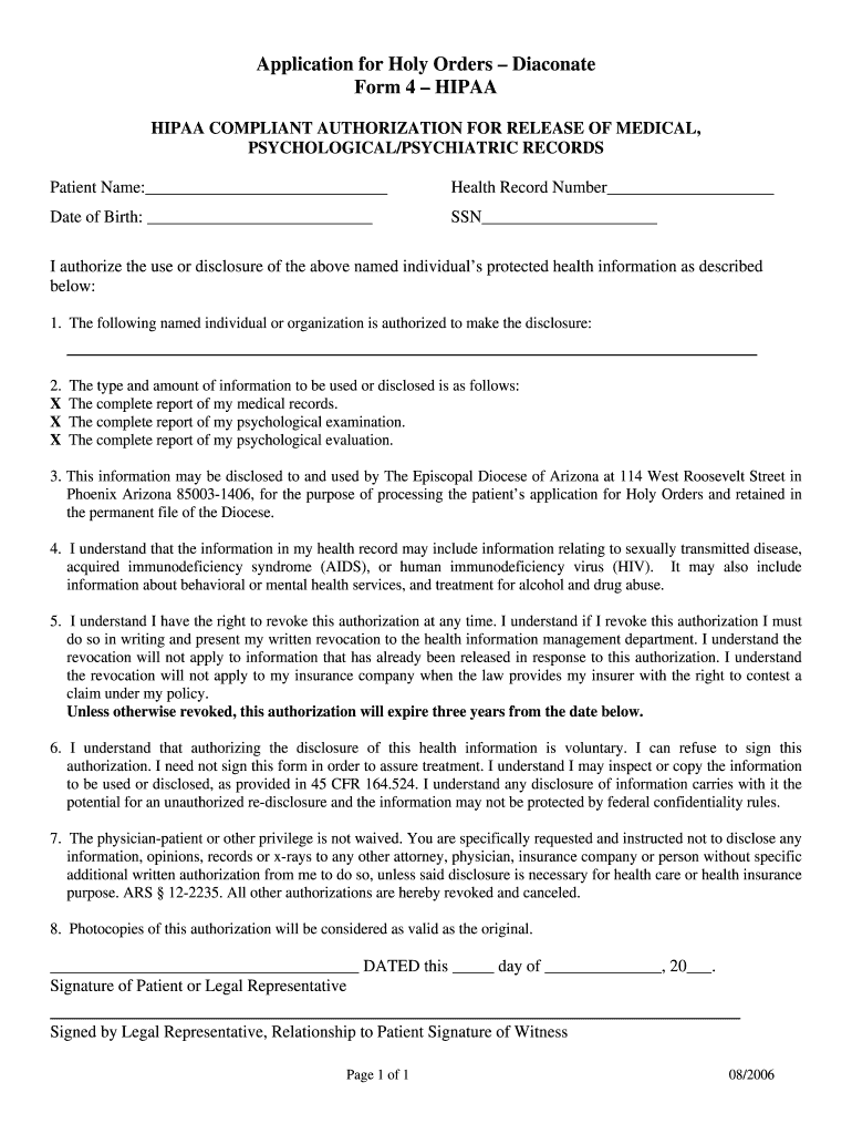 Application for Holy Orders Diagonal Form 4 HIPAA COMPLIANT AUTHORIZATION FOR RELEASE OF MEDICAL, PSYCHOLOGICAL/PSYCHIATRIC RECORDS Patient Name: Health Record Number Date of Birth: SSN I authorize