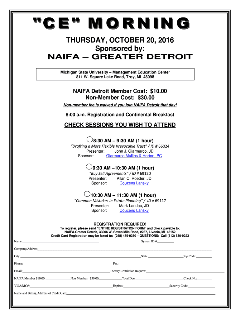 00 Non-Member Cost 30. 00 Non-member fee is waived if you join NAIFA Detroit that day 8 00 a.m. Registration and Continental Breakfast CHECK SESSIONS YOU WISH TO ATTEND 8 30 AM 9 30 AM 1 hour Drafting a More Flexible Irrevocable Trust / ID 66024 Presenter John J. Giarmarco JD Sponsor Giarmarco Mullins Horton PC 9 30 AM 10 30 AM 1 hour Buy Sell Agreements / ID 69120 Allan C. Roeder JD Couzens Lansky 10 30 AM 11 30 AM 1 hour Common Mistakes In Estate Planning / ID 69117 Mark Landau JD...