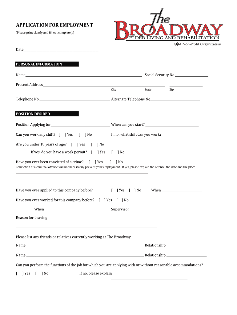 To complete the Application for Employment, you must be of legal age to work and have valid contact information. Generally, a background check may be conducted, and specific job positions might have additional requirements.