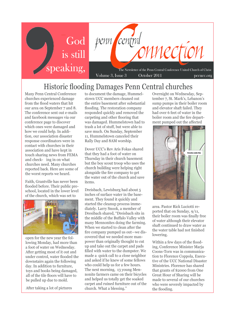 God is still speaking, The Newsletter of the Penn Central Conference United Church of Christ Volume 3, Issue 3 October 2011 CCNUCC.org Historic flooding Damages Penn Central churches Many Penn Central