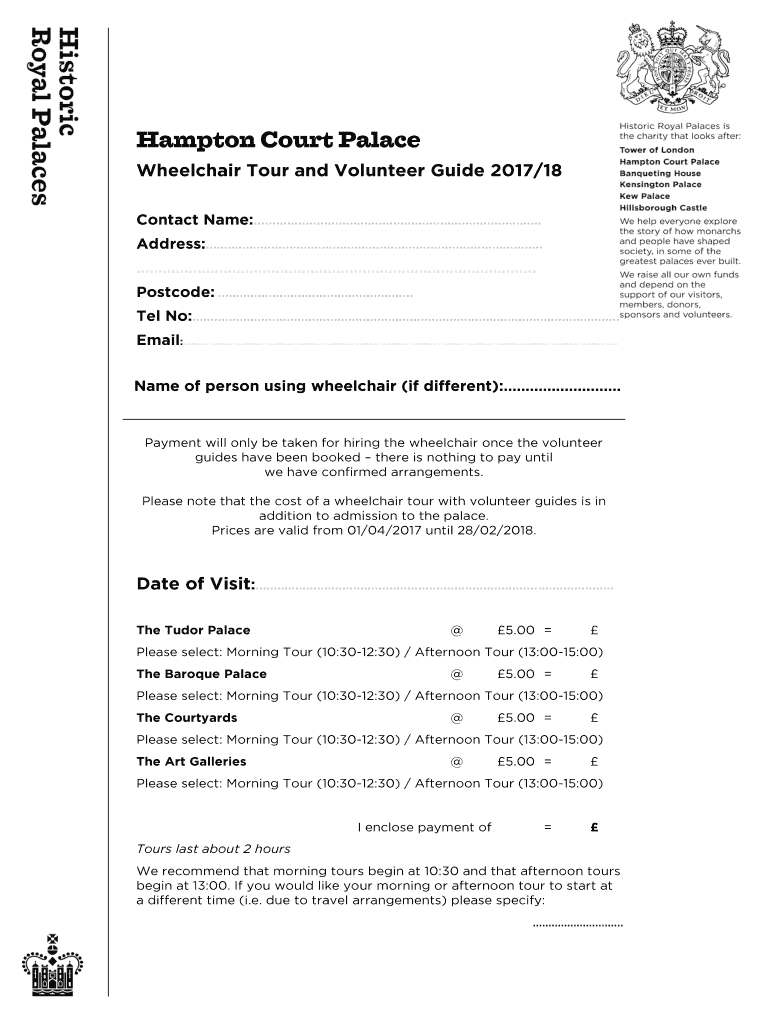 Otherwise you can buy admission tickets in advance via our website www. hrp.org. uk or at the ticket office on the day of your visit. Prices are valid from 01/04/2017 until 28/02/2018. Date of Visit The Tudor Palace Please select Morning Tour 10 30-12 30 / Afternoon Tour 13 00-15 00 The Baroque Palace The Courtyards The Art Galleries I enclose payment of Tours last about 2 hours We recommend that morning tours begin at 10 30 and that afternoon tours begin at 13 00. If you...