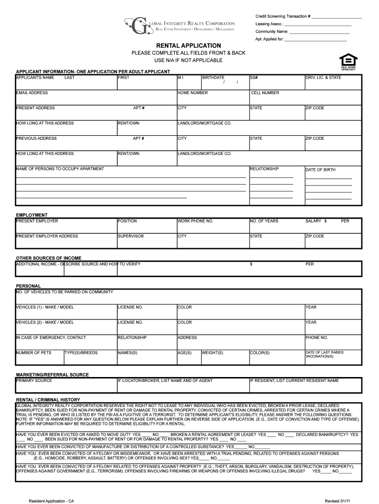 The California Rental Application Form is a crucial document used by prospective tenants applying to rent residential properties in California. This form facilitates the rental application process by collecting essential information required for tenant screening. Signatures from both the applicant and a representative of Global Integrity Realty Corporation are necessary, ensuring accountability and legality in the application process.