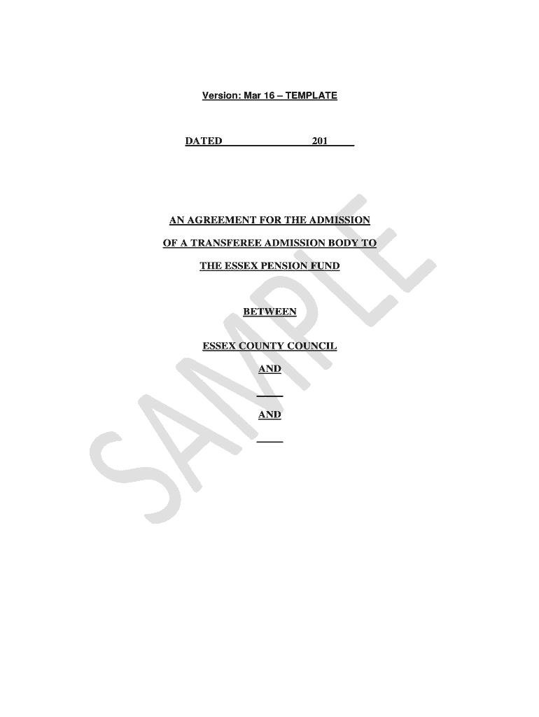 Clause 7. 1 or Sub-Clause 7. 2. 2 within 30 days of receipt of a written request from Any Eligible Employees AVCs or SCAVCs are to be paid direct to such approved AVC body and/or AVC insurance company selected by the Administering following the deduction of such contributions. Version Mar 16 TEMPLATE DATED AN AGREEMENT FOR THE ADMISSION OF A TRANSFEREE ADMISSION BODY TO THE ESSEX PENSION FUND BETWEEN ESSEX COUNTY COUNCIL AND THIS AGREEMENT is made the day of Two thousand and Administering...