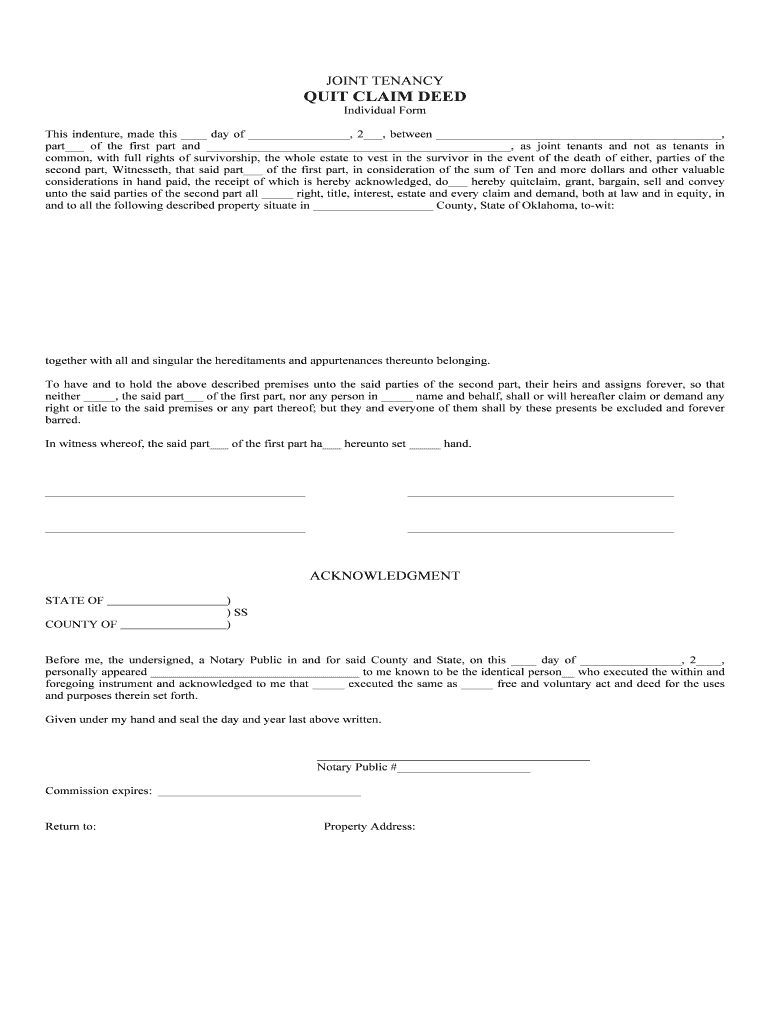 The Joint Tenancy Quit Claim Deed is a legal document used by property owners in Oklahoma to transfer property rights as joint tenants with rights of survivorship.