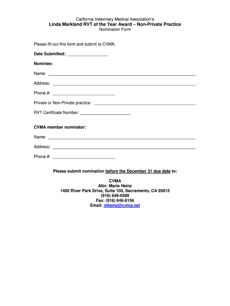 Date Submitted Nominee Name Address Phone Private or Non-Private practice RVT Certificate Number CVMA member nominator Please submit nomination before the December 31 due date to CVMA Attn Marie Heinz 1400 River Park Drive Suite 100 Sacramento CA 95815 916 649-0599 Fax 916 646-9156 Email mheinz cvma.net. California Veterinary Medical Association s Linda Markland RVT of the Year Award Non-Private Practice Nomination Form Please fill out this form and submit to CVMA.