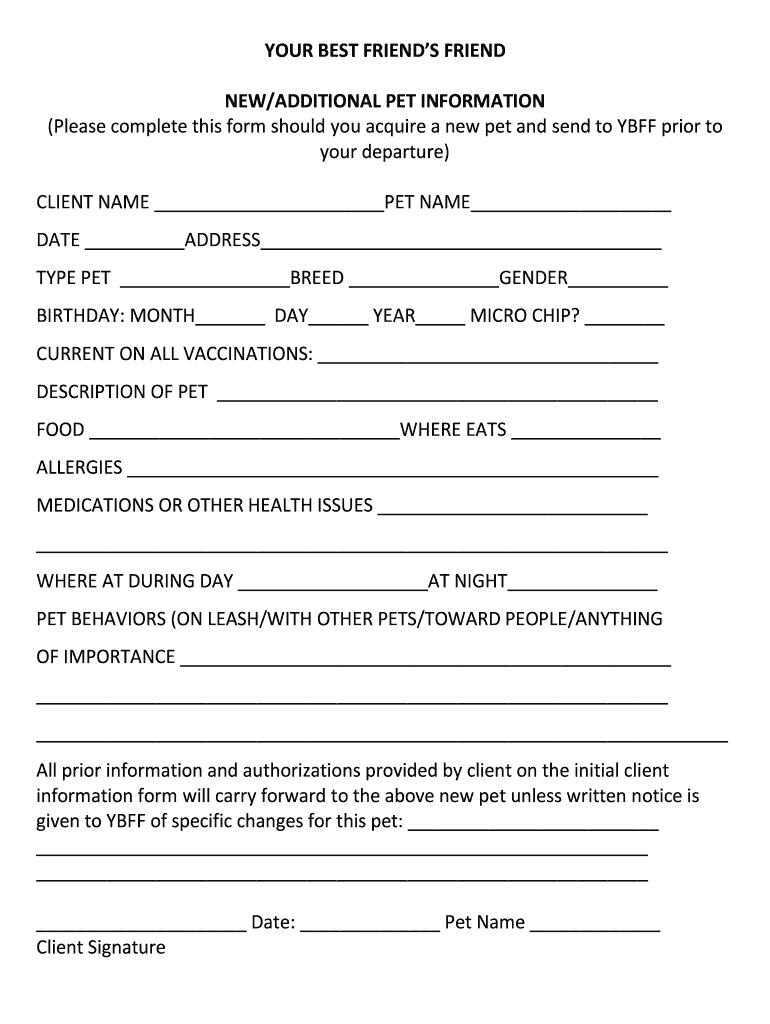 YOUR BEST FRIEND S FRIEND NEW/ADDITIONAL PET INFORMATION Please complete this form should you acquire a new pet and send to YBFF prior to your departure CLIENT NAME PET NAME DATE ADDRESS TYPE PET BREED GENDER BIRTHDAY MONTH DAY YEAR MICRO CHIP CURRENT ON ALL VACCINATIONS DESCRIPTION OF PET FOOD WHERE EATS ALLERGIES MEDICATIONS OR OTHER HEALTH ISSUES WHERE AT DURING DAY AT NIGHT PET BEHAVIORS ON LEASH/WITH OTHER PETS/TOWARD PEOPLE/ANYTHING OF IMPORTANCE All prior information and authorizations...