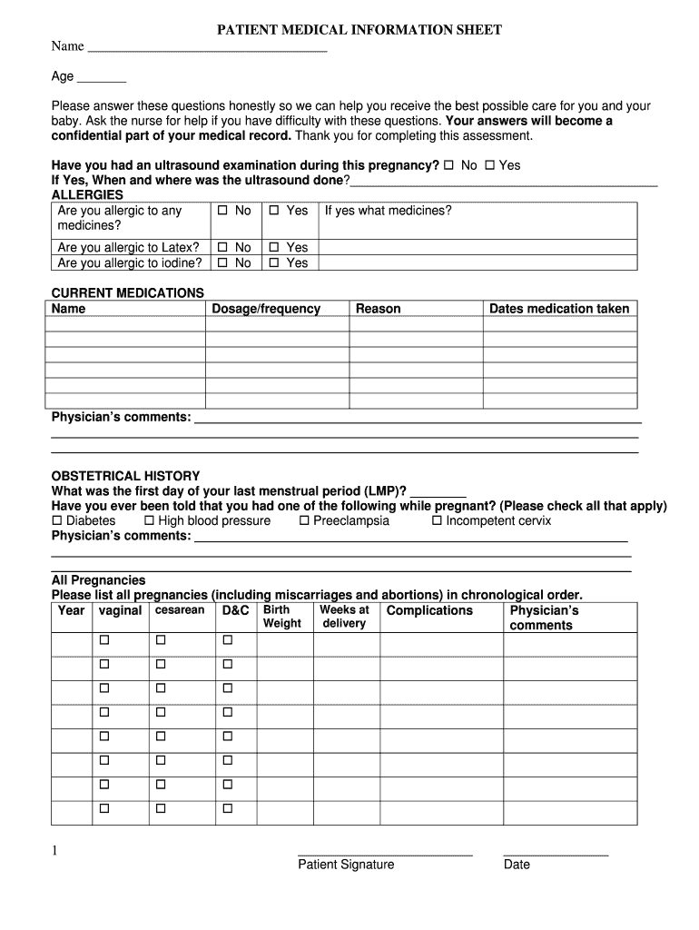 PATIENT MEDICAL INFORMATION SHEET Name Age Please answer these questions honestly, so we can help you receive the best possible care for you and your baby. Ask the nurse for help if you have difficulty