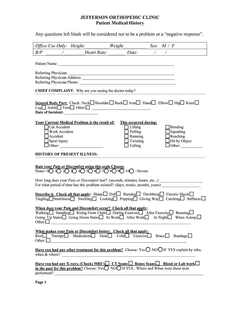 JEFFERSON ORTHOPEDIC CLINIC Patient Medical History Any questions left blank will be considered not to be a problem or a negative response. Office Use Only: Height: Weight Sex: M / F B/P / Heart Rate: