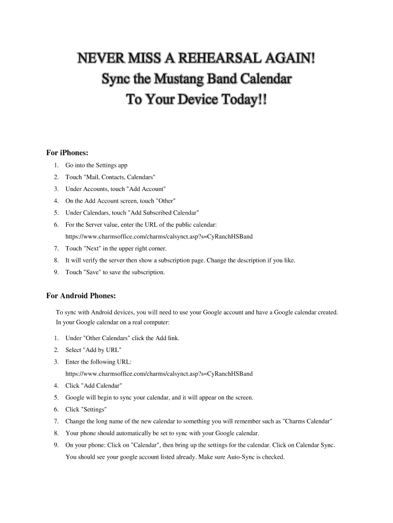 NEVER MISS A REHEARSAL AGAIN! Sync the Mustang Band Calendar To Your Device Today!! For iPhones: 1. Go into the Settings app2. Touch “Mail, Contacts, Calendars “3. Under Accounts, touch “Add