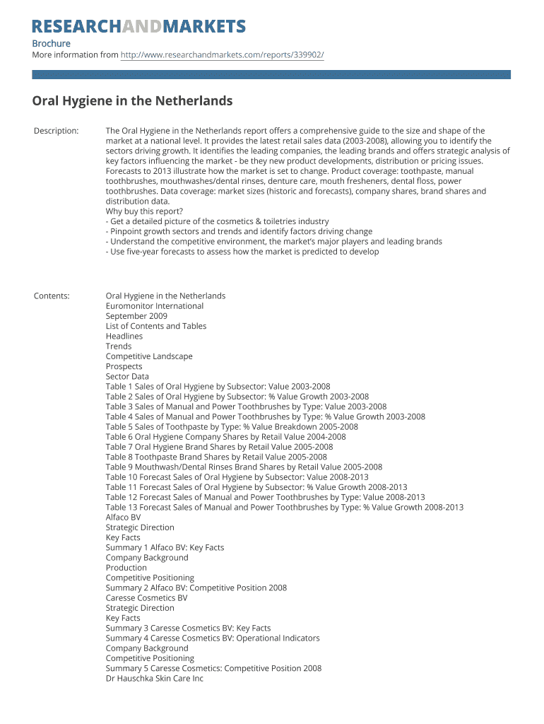 Brochure More information from http://www.researchandmarkets.com/reports/339902/ Oral Hygiene in the Netherlands Description: The Oral Hygiene in the Netherlands report offers a comprehensive guide
