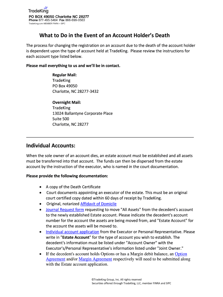 What to Do in the Event of an Account Holder s Death The process for changing the registration on an account due to the death of the account holder is dependent upon the type of account held at Trade