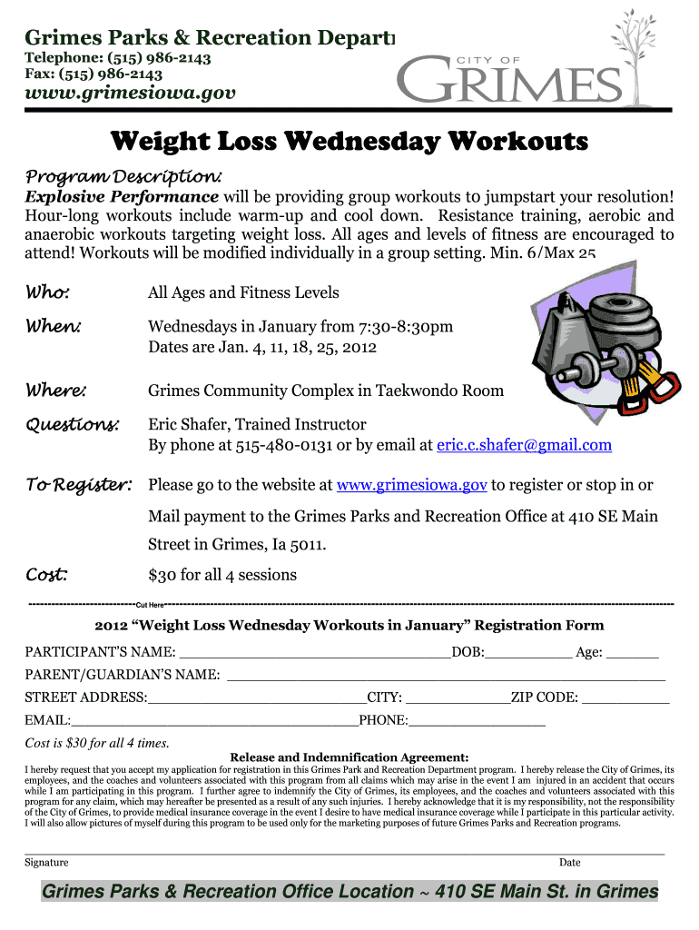 Grimesiowa.gov to register or stop in or Mail payment to the Grimes Parks and Recreation Office at 410 SE Main Street in Grimes Ia 5011. Grimes Parks Recreation Department Telephone 515 986-2143 Fax 515 986-2143 www. grimesiowa.gov Weight Loss Wednesday Workouts Program Description Explosive Performance will be providing group workouts t0 jumpstart your resolution Hour-long workouts include warm-up and cool down. Resistance training aerobic and anaerobic workouts targeting weight loss. All...