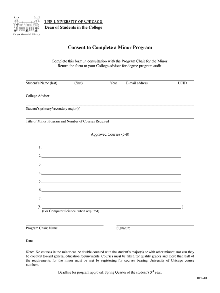 The University of Chicago Minor Program Consent Form is a consent document used by students to declare their intent to complete a minor program.