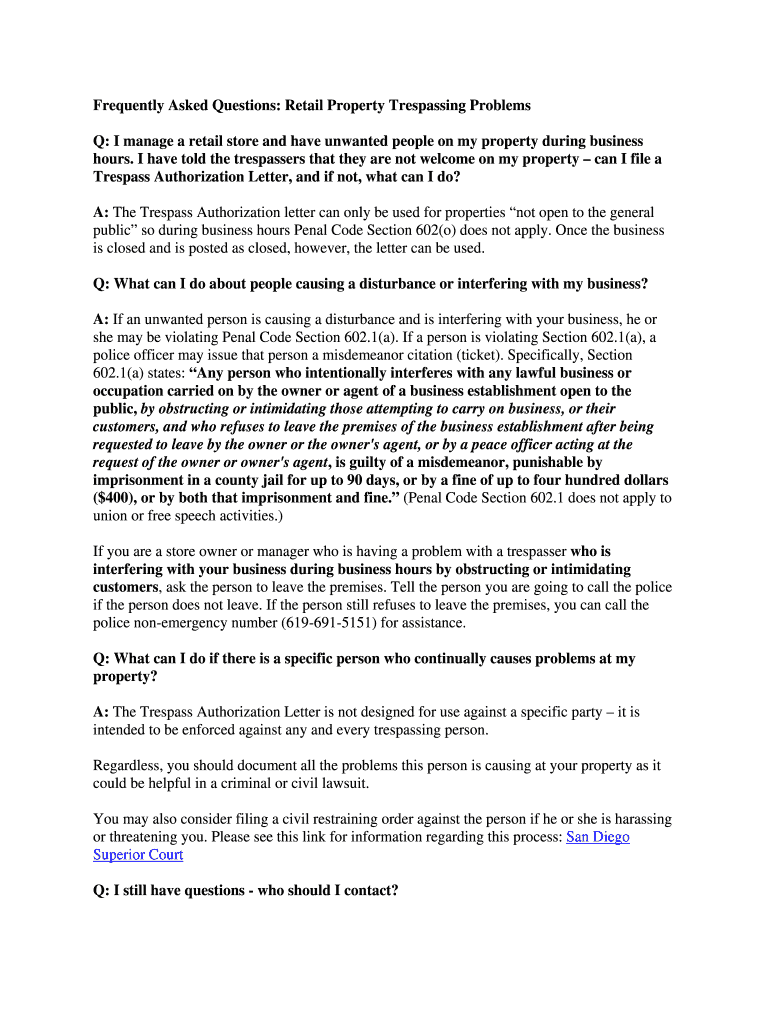 Frequently Asked Questions: Retail Property Trespassing Problems Q: I manage a retail store and have unwanted people on my property during business hours. I have told the trespassers that they are