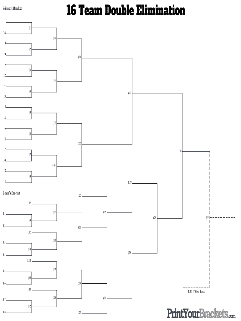 16 Team TeamDouble DoubleElimination Elimination Winner s Bracket L27 Loser s Bracket L22 L16 L1 L2 L15 L3 L4 L14 L5 L6 L13 L30 If First Loss L7 L8 L21 PrintYourBrackets.