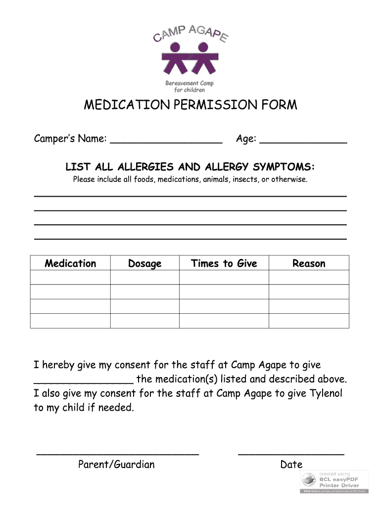 The form requires details such as the camper's name, age, any allergies, the name of the medication being administered, dosage, times, and a signature from the parent or guardian.