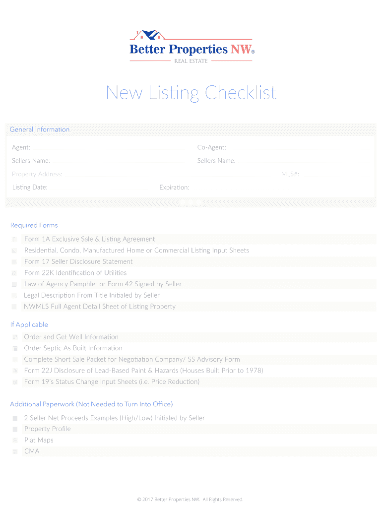 New Listing Checklist General Information Agent Co-Agent Sellers Name Property Address MLS Listing Date Expiration Required Forms Form 1A Exclusive Sale Listing Agreement Residential Condo Manufactured Home or Commercial Listing Input Sheets Form 17 Seller Disclosure Statement Form 22K Identi cation of Utilities Law of Agency Pamphlet or Form 42 Signed by Seller Legal Description From Title Initialed by Seller NWMLS Full Agent Detail Sheet of Listing Property If Applicable Order and Get Well...