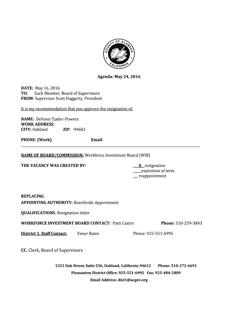 Agenda May 24 2016 DATE May 16 2016 TO Each Member Board of Supervisors FROM Supervisor Scott Haggerty President It is my recommendation that you approve the resignation of NAME DeVonn Tjader-Powers WORK ADDRESS CITY Oakland ZIP 94602 PHONE Work Email NAME OF BOARD/COMMISSION Workforce Investment Board WIB THE VACANCY WAS CREATED BY Xresignation expiration of term reappointment REPLACING APPOINTING AUTHORITY Boardwide Appointment QUALIFICATIONS Resignation letter WORKFORCE INVESTMENT BOARD...