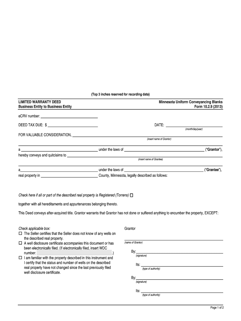 A well disclosure certificate accompanies this document or has been electronically filed. If electronically filed insert WDC. Top 3 inches reserved for recording data LIMITED WARRANTY DEED Business Entity to Business Entity Minnesota Uniform Conveyancing Blanks Form 10. 2. 9 2013 eCRV number DEED TAX DUE DATE FOR VALUABLE CONSIDERATION month/day/year insert name of Grantor a hereby conveys and quitclaims to under the laws of Grantor real property in County Minnesota legally described as...
