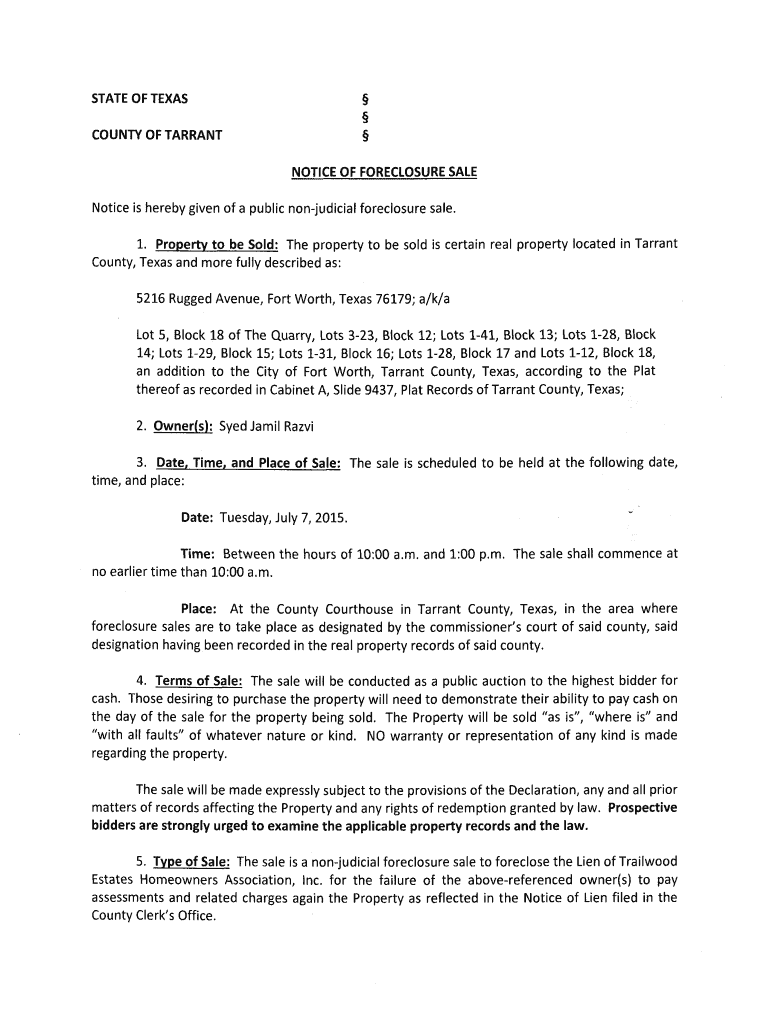 Page 1of1 December 1 2014 Joseph Imad Yammine individually and dba JW Construction Demolition Being Lot 19A Block 46 M. TRUSTEE This instrument was acknowledged before me on June 15 2015 by Gregory W. Monroe Trustee. - STEPHANIE M. Owner s Helen M. McCray Spring Ranch Homeowners Association Inc. for the failure of the above-referenced owner s to pay MC nning Meyers Attorneys at Law 816 Cheryl Street Crowley Texas 76036 a/k/a Tarrant County Texas 2. Md cont. linjng O. M acres of li m l....