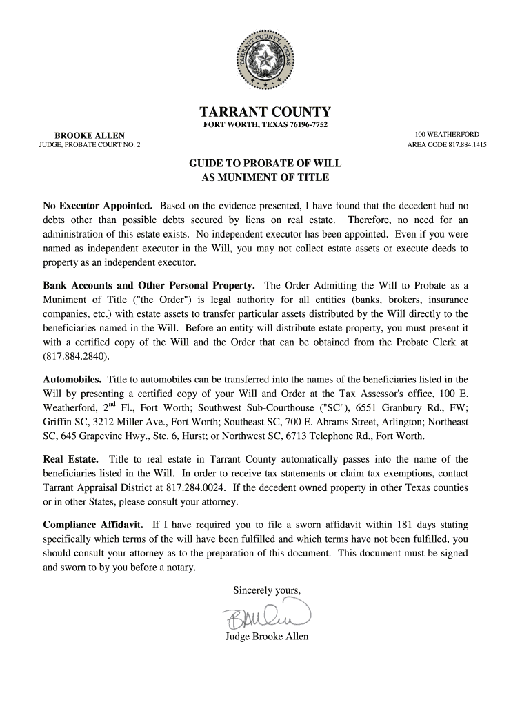 FW Griffin SC 3212 Miller Ave. Fort Worth Southeast SC 700 E. Abrams Street Arlington Northeast SC 645 Grapevine Hwy. TARRANT COUNTY FORT WORTH TEXAS 76196-7752 100 WEATHERFORD AREA CODE 817. 884. 1415 BROOKE ALLEN JUDGE PROBATE COURT NO. Ste. 6 Hurst or Northwest SC 6713 Telephone Rd. Fort Worth. Real Estate. Title to real estate in Tarrant County automatically passes into the name of the Tarrant Appraisal District at 817. 884. 2840. Automobiles. Title to automobiles can be transferred into...