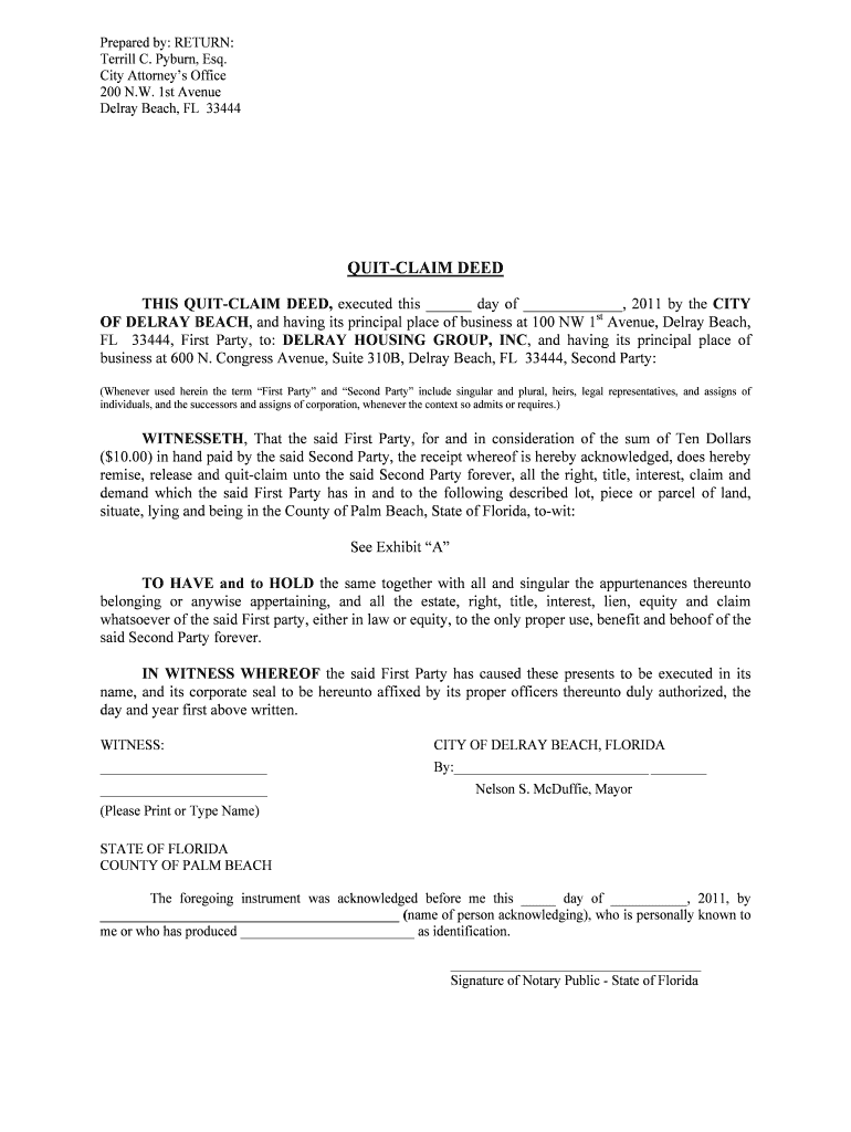Prepared by RETURN Terrill C. Pyburn Esq. City Attorney s Office 200 N.W. 1st Avenue Delray Beach FL 33444 QUIT-CLAIM DEED THIS QUIT-CLAIM DEED executed this day of 2011 by the CITY OF DELRAY BEACH and having its principal place of business at 100 NW 1st Avenue Delray Beach FL 33444 First Party to DELRAY HOUSING GROUP INC and having its principal place of business at 600 N. Congress Avenue Suite 310B Delray Beach FL 33444 Second Party Whenever used herein the term First Party and Second Party...