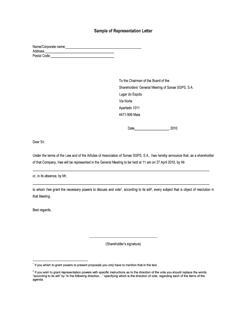 Lugar do Espido Via Norte Apartado 1011 4471-909 Maia Date Dear Sir Under the terms of the Law and of the Articles of Association of Sonae SGPS S.A. The Shareholders General Meeting will meet on 27 April 2010 at 11 am in the registered Office at Lugar do Espido Via Norte Maia. The agenda and information regarding consultation of documents is included in the notice of the meeting. 4. A corporate shareholder may be represented at a Shareholders General Meeting by a person designated by means of...