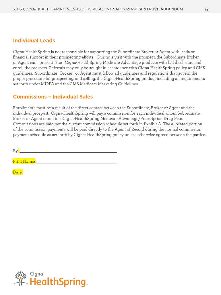 Without Cigna-HealthSpring prior approval Cigna-HealthSpring Referral Broker Broker/Agent who is directly contracted with Cigna-HealthSpring to receive referral broker commission from Cigna-HealthSpring and does not sell CignaHealthSpring products but provides leads to Cigna-HealthSpring employed sales representatives. Subordinate Broker or Agent agrees to sign this Addendum and the Cigna-HealthSpring Contracted Sales Agent HIPAA Agreement in the form provided by Cigna-HealthSpring. The FMO...