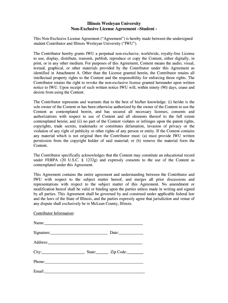 Illinois Wesleyan University Non-Exclusive License Agreement Student This Non-Exclusive License Agreement Agreement is hereby made between the undersigned student Contributor and Illinois Wesleyan University IWU. Under FERPA 20 U.S.C. 1232g and expressly consents to the use of the Content as contemplated under this Agreement. Upon receipt of such written notice IWU will within ninety 90 days cease and desists from using the Content. The Contributor retains the right to revoke the...
