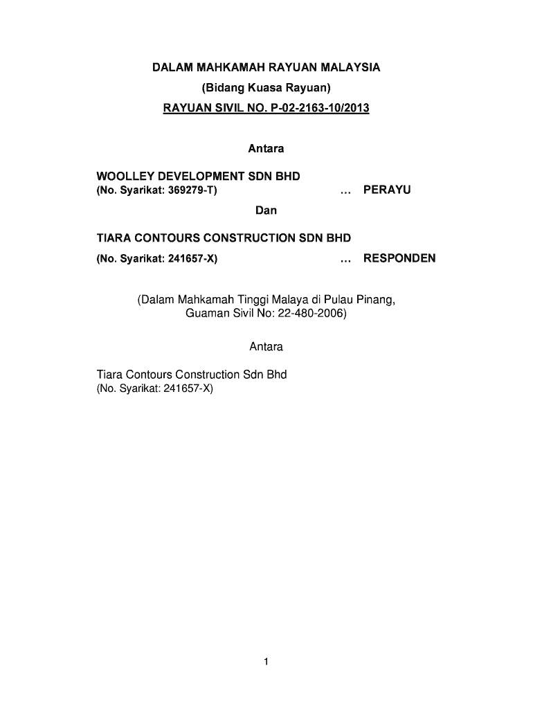 DALAM MAHKAMAH RAYUAN MALAYSIA Bidang Kuasa Rayuan RAYUAN SIVIL NO. P-02-2163-10/2013 WOOLLEY DEVELOPMENT SDN BHD No. Syarikat 369279-T PERAYU Dan TIARA CONTOURS CONSTRUCTION SDN BHD No. Syarikat 241657-X RESPONDEN Dalam Mahkamah Tinggi Malaya di Pulau Pinang Guaman Sivil No 22-480-2006 Tiara Contours Construction Sdn Bhd. Plaintif Defendan Pertama Defendan Kedua 1. Cherating Development Sdn Bhd 2. Woolley Development Sdn Bhd CORUM LINTON ALBERT JCA HAMID SULTAN BIN ABU BACKER JCA NALLINI...
