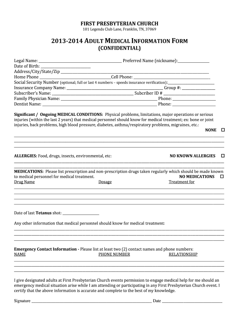 FIRST PRESBYTERIAN CHURCH 101 Legends Club Lane, Franklin, TN, 37069 2013-2014 ADULT MEDICAL INFORMATION FORM (CONFIDENTIAL) Legal Name: Preferred Name (nickname): Date of Birth: Address/City/State/Zip