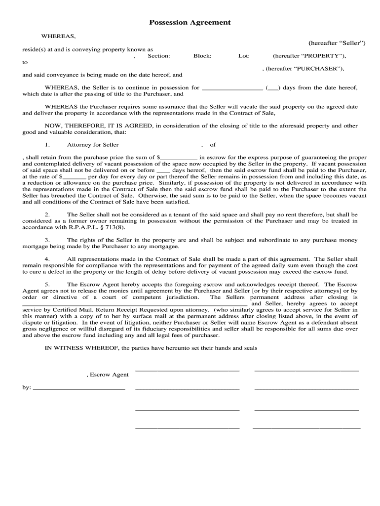 The Possession Agreement is a legal document used by sellers and purchasers in real estate transactions to define terms regarding property possession post-sale.