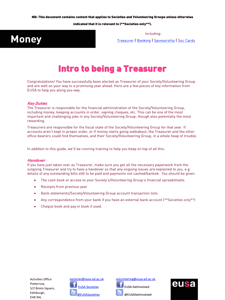 NB: This document contains content that applies to Societies and Volunteering Groups unless otherwise indicated that it is relevant to (**Societies only**). Including:MoneyTreasurer Banking Sponsorship